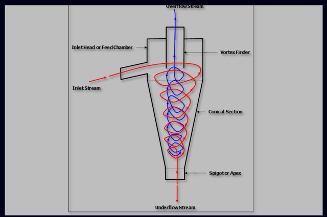 The general operation principle of the hydrocyclone is based on the terminal settling velocity of the particle in the centrifugal field generated against the gravitational field within the unit. Hydrocyclones is a constant volume unit that separates particles of a given specific density based on mass, that is, heavy particles report to the underflow and light particles to the overflow. The underflow will consist of coarse particles and high slurry density whereas the overflow has low slurry density and fine particles.